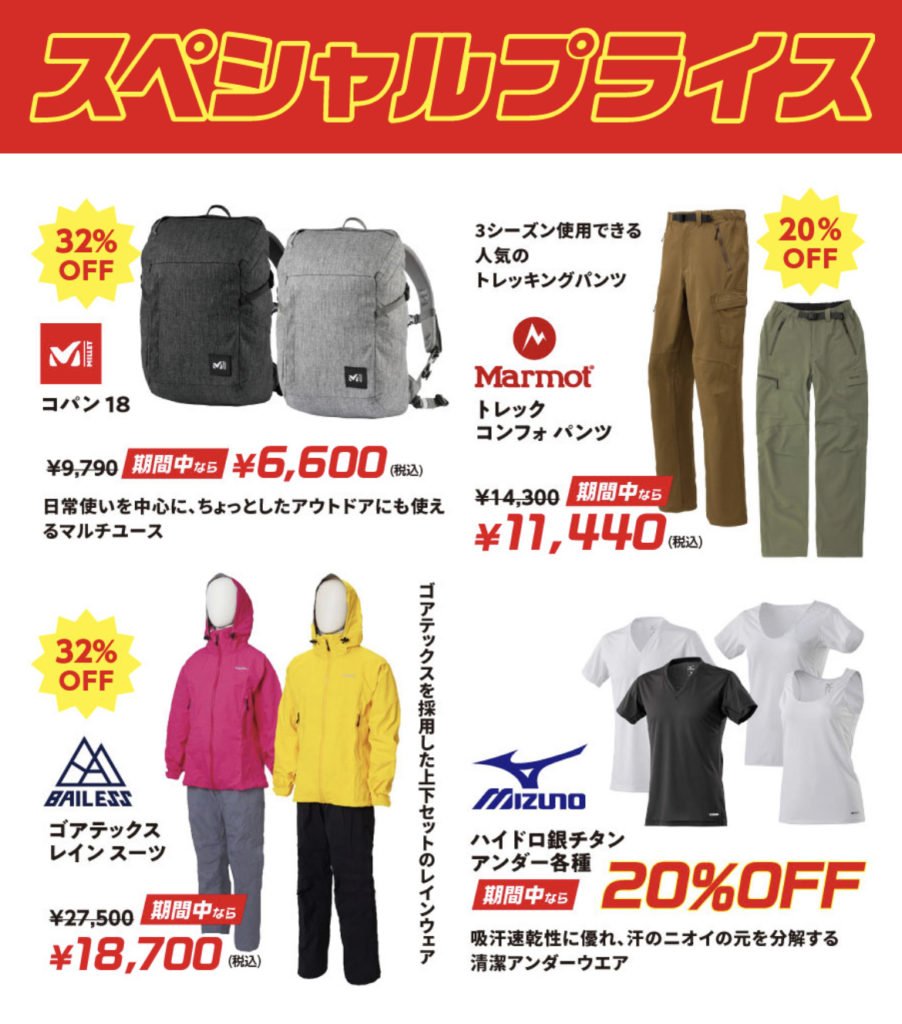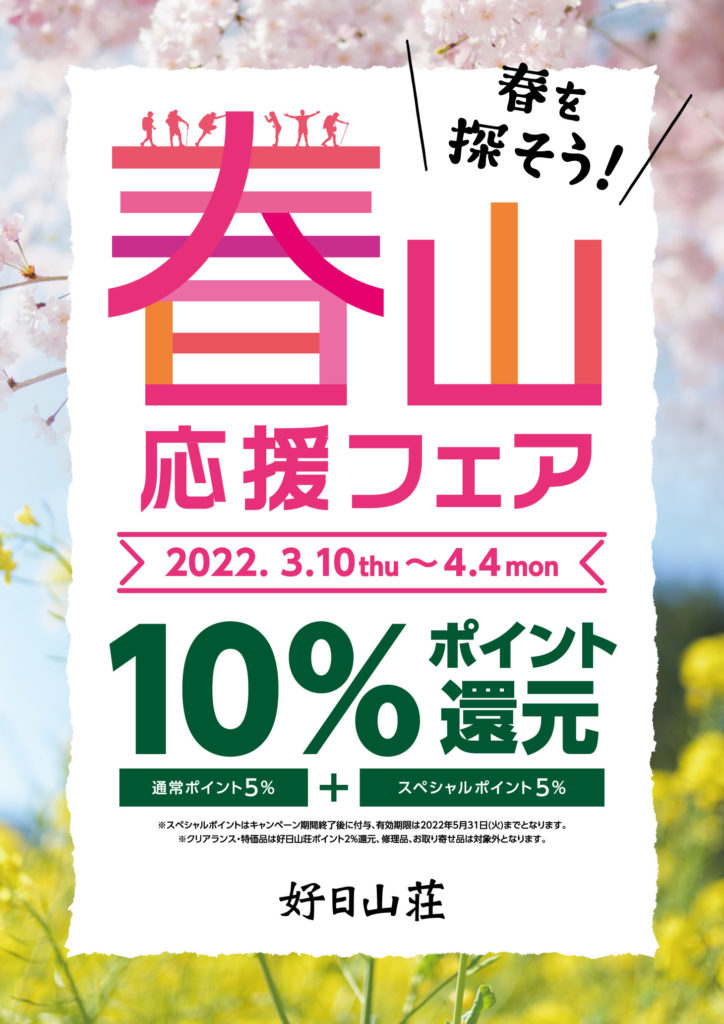 好日山荘では春山応援フェア期間中、10~15%ポイント還元にアップする他、期間限定のお買得商品もご用意しております♪
