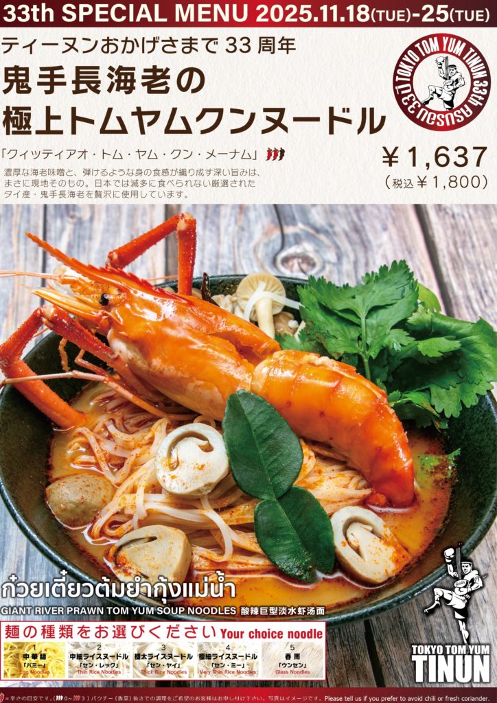 "タイ産 鬼手長海老"を使用した、33周年限定のプレミアムトムヤムヌードルを販売!!
