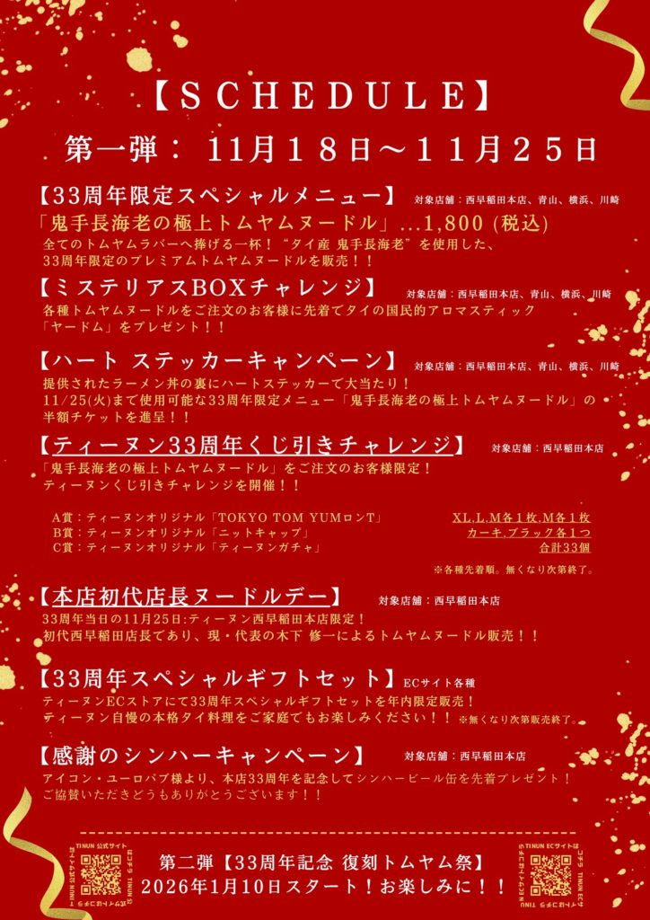 さらに、第二弾【33周年記念 復刻トムヤム祭】は2026年1月10日スタート!お楽しみに!!