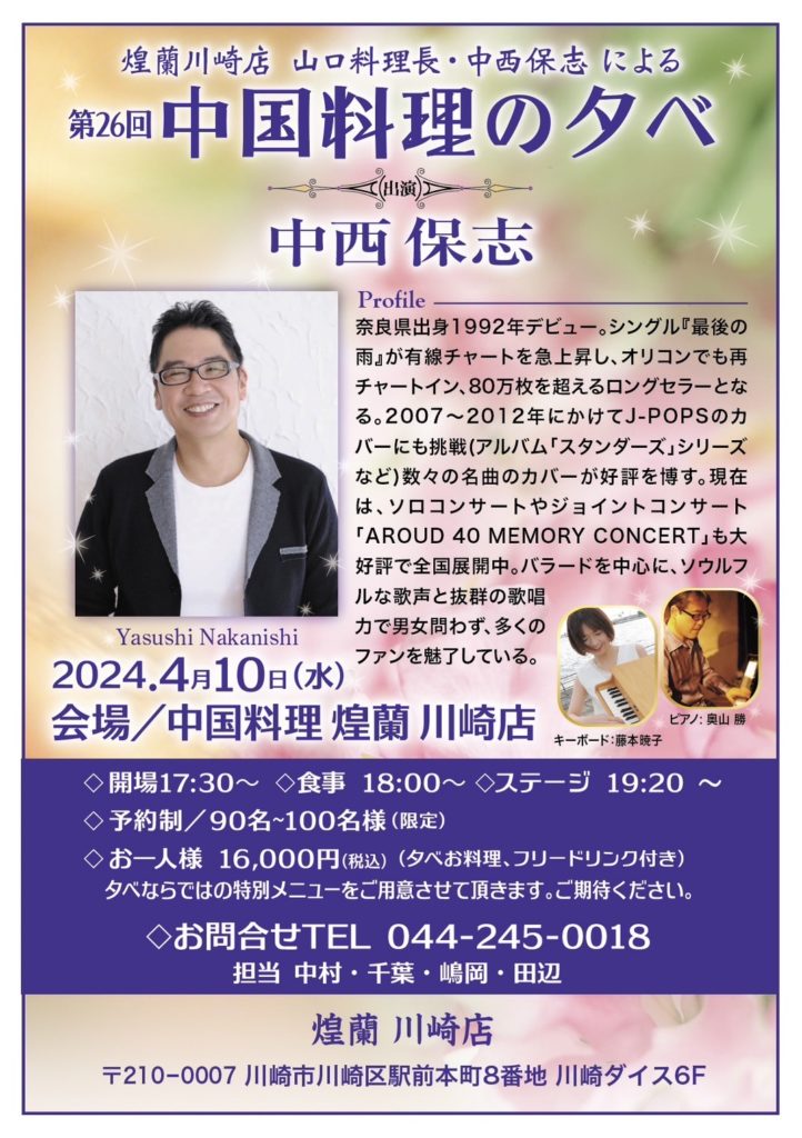 4/10(水)煌蘭川崎店 山口料理長・中西保志さんによる