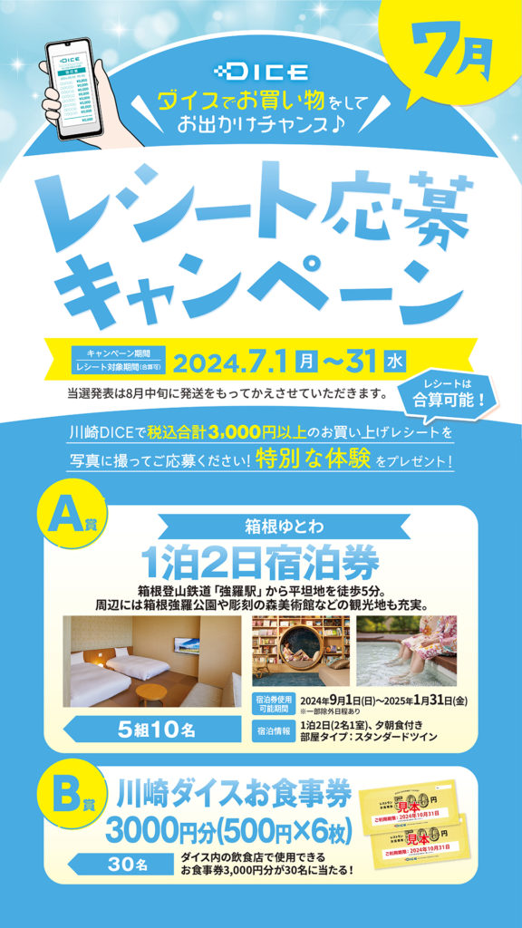 期間中、川崎ダイスで税込み合計3,000円以上のお買い上げレシートを撮影してご応募ください!